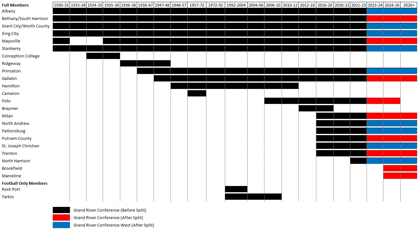 On December 4, 1929, in the offices of Stanberry Superintendent L.A. Zelliff, several schools met to form an athletic conference in Northwest Missouri. The conference was established to schedule football and basketball games and track meets to help cut down on travel expenses. Other goals of the conference were to increase interest among the member schools and increase gate receipts. By December 6, King City, Stanberry, Maysville and Bethany had paid for the membership fee of $2. Grant City had signified their interest and Albany was also being considered. The conference named F.E. Patrick of Bethany as their first president, and R.H. Watson of King City as their first secretary-treasurer. By January of the next year, Grant City and Albany had joined, but the conference was still without a name. Princeton also applied for admission at the time but was denied due to travel concerns and conditions of the roads in those days. The naming of the conference was left to students of the six schools. The name “Grand River Six” was selected. The name was chosen over “Grand River Valley Conference”, “Grand River Conference”, “Blue Grass Conference”, “Northwest Six”, “Little Six”, “Big Six”, “Small Six”, “Quad County Six”, “Pine to Palm Conference”, “Athletic Six” and “Ever Ready Conference”. The first athletic event of the new Grand River Six was originally scheduled to be a basketball tournament at King City. At a meeting of the members in Stanberry on January 25, 1930, drawings for the first tournament were conducted. Albany and Bethany were scheduled to compete in the first ever competition of the Grand River Six on Friday, February 21, 1930 followed by Maysville and Stanberry. However, the tournament ended up being canceled due to a conflict with sub-districts in Albany. The original ticket prices were to be 25 cents for students the first-round and semi-final games and 35 cents for the finals. Admission for adults were to be 35 cents and 50 cents respectively. On March 15, 1930, the members of the conference decided to hold the first track, field and golf meet on April 11. The track meet was held at the Fairgrounds in Bethany. Each school was permitted to enter two men in each event. Maysville won the track meet with 56.5 points and Bethany finished second with 53.5 points. Donald Thrailkill of Albany won the Golf tournament with a score of 85. On April 17, 1930, the conference set the first ever football schedule. The first games were played on Friday, October 3, 1930. Albany traveled to Stanberry and King City played at Grant City in the first conference football games. Due to Maysville having a non-conference game scheduled on October 3, Bethany and Maysville did not play their first conference game until October 10. Bethany and Maysville ended up playing on Thanksgiving Day for the conference championship. Bethany defeated Maysville 18-6. Maysville led 6-0 going into the fourth quarter before Bethany scored three touchdowns to win. On September 25, 1930, the conference scheduled its first ever regular-season basketball games for the 1930-1931 school year. Bethany traveled to King City on December 12, 1930 for the first conference game. Maysville won the first conference championship in basketball with a record of 9-1. The conference started out as the Grand River Six, but it would not stay at six teams for long. With additions (and subtractions) to the conference and the number of teams changing over time, people would start to refer to the conference simply as the Grand River Conference or the GRC. The first change in the conference occurred in 1933. In September 1933, Maysville had just graduated most of their conference championship team from the year before. Coach Lon Wilson of Maysville was hesitant about “fielding a team of green timber.” As a result, Maysville decided to cancel all of their conference games for the 1933 season. There were some that believed that Maysville cancelled their games due to not having a championship caliber team; however, others stated that they simply did not have boys big enough to play football at all “except at great risk to their limbs and their lives.” During their meetings on October 18, the conference dropped Maysville as a member of the conference. Originally, the sentiment was to just suspend Maysville, but the other members ultimately voted to eject Maysville from the conference. The conference wasted no time in finding a replacement for Maysville. The conference invited Conception College to take the place of Maysville. The conference would be back at six teams. Conception formally accepted the invitation on March 12, 1934 in time to play in the conference’s first baseball season. Conception would win the Grand River Conference baseball championship in its first season. It didn’t take long for the Maysville and the rest of the conference to make amends. On February 25, 1935, the conference voted to allow Maysville back in the conference. For the first time, the Grand River Conference would have seven teams. On March 16, 1936, the GRC expanded to eight teams by inviting Ridgeway. Savannah also applied for admission, but was not invited. The eight-team conference would not last long. In June of 1936, Conception notified the conference that they had decided to withdraw after only a little over two years in the conference. Alumni and faculty of Conception were concerned about the travel and wanted to play teams in towns closer to them. Conception College’s tenure in the GRC was the shortest of any school in its history. On September 12, 1938, Princeton once again applied for membership into the Grand River Conference. This time, they were admitted unanimously. They began play in the GRC starting with the 1938-39 basketball season marking the first time that the conference officially competed as an eight-team conference. Princeton’s entry in the GRC marked the 6th change in member ship 